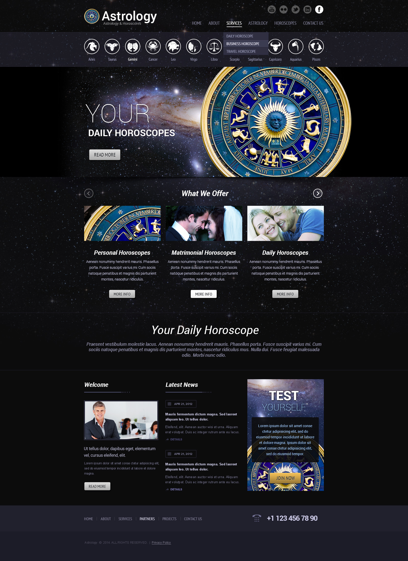 Introducing our most recent astrology website template. This template is your last step towards a fruitful, successful business. If you run a company that deals with the science of horoscope theme, here’s what Gridgum has for you. A horoscope template that starts from the top right corner with the 6 most common tabs that highlight the outline of your website. After that comes a small icon of all 12 horoscopes that you can click to read more about. Then, comes our beautiful slideshow where you should put the highlights of your company and services.