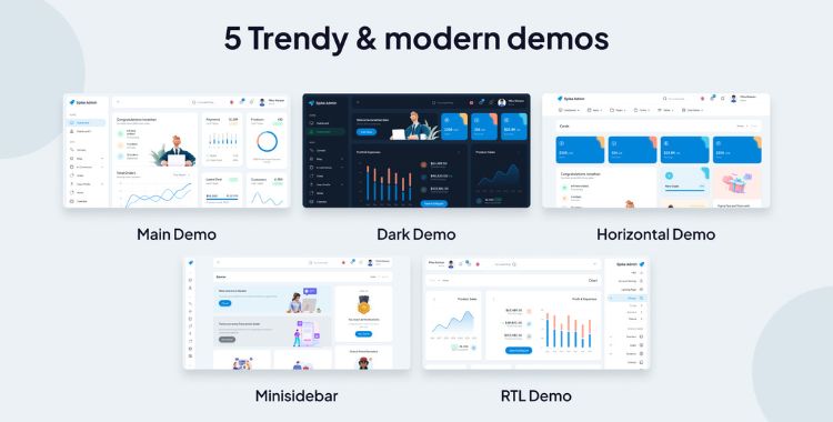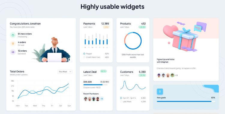 Its array of innovative dashboard layouts caters to every possible admin need. Tailored for different scenarios, from tracking application performance to monitoring e-commerce metrics, there’s always a perfect fit for your project.