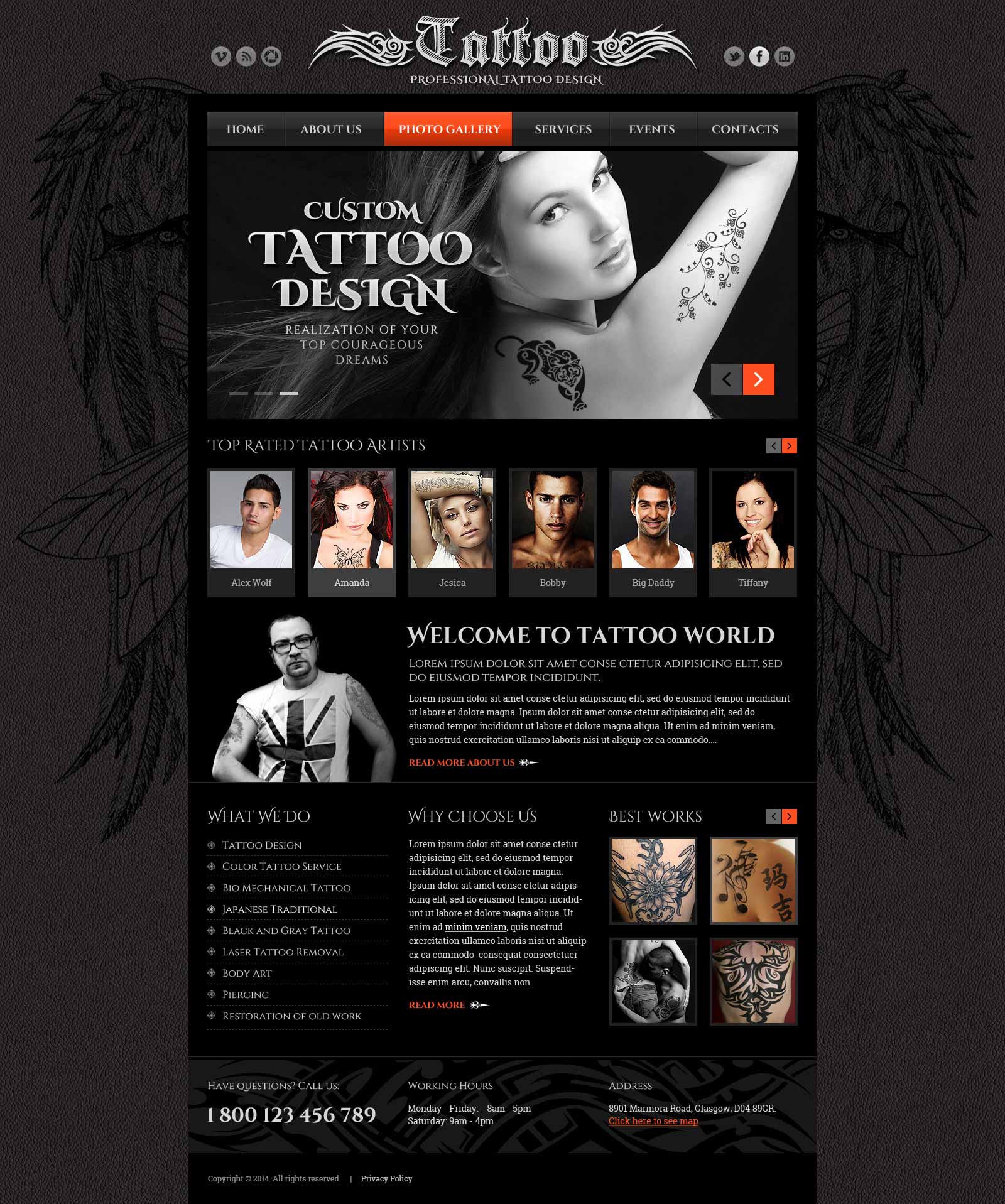 Then you can see a card plan which comes underneath the title "Welcome to Tattoo world". It essentially helps you to whole up various administrations that you offer in your organization. At the bottom, you can see small sections for What We Do, Why Choose Us and Best Works. Each joined by the capacity of tapping the "read more" in order to read about a specific artist. Toward the end we furnish you with the capacity of inviting your visitor, express your main goal and achievement and redesign your latest news.